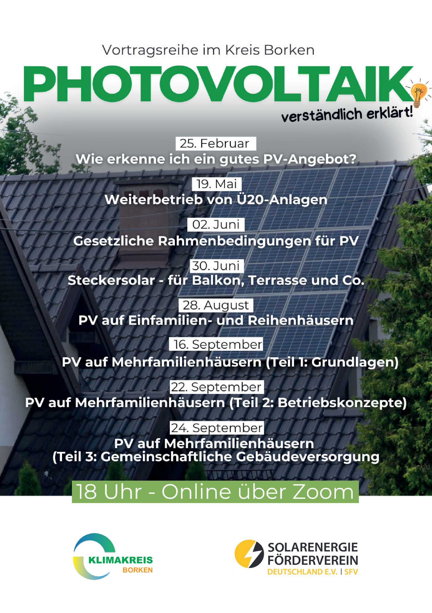 Die Informationskampagne zur Solarenergie des Klimakreis Borken in Kooperation mit der Verbraucherzentrale NRW wird fortgesetzt. Zwei Online-Seminare bieten kompakte und praxisnahe Informationen rund um Photovoltaik: für Eigentümer:innen ebenso wie für Mieter:innen.