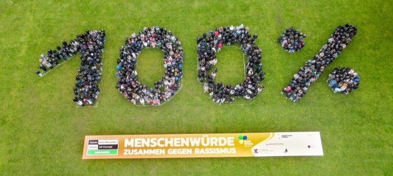 Gronauer Park unter dem historischen Wasserturm statt.Unter dem Motto „100% Menschenwürde – Zusammen gegen Rassismus und Rechtsextremismus“ fanden sich vormittags insgesamt ca. 700 Schüler: innen auf dem Grün des Gronauer Stadtparks ein. Alle weiterführenden Schulen Gronaus – die Gesamtschule Gronau, die Euregio-Gesamtschule Epe, das Werner-von-Siemens-Gymnasium Gronau, die Fridtjof Nansen Realschule Gronau und das Driland Kolleg – waren in diese Aktion eingebunden. Mit guter Laune sandten die Schüler: innen ein klares Zeichen für ein respektvolles Miteinander im alltäglichen Leben.