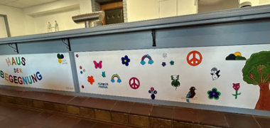 Am 1. September 2025 fand im Haus der Begegnung ein kreativer Workshop anlässlich des Antikriegstags statt. Bewohner:innen hatten die Gelegenheit, bunte Muster, Friedenssymbole und positive Botschaften auf Banner zu malen. An der Aktion beteiligten sich geflüchtete Menschen verschiedener Nationen. Gemeinsam mit dem Team Integration der Stadt Gronau entstand so ein kraftvolles Symbol für Frieden und Zusammenhalt in der Gemeinschaft.