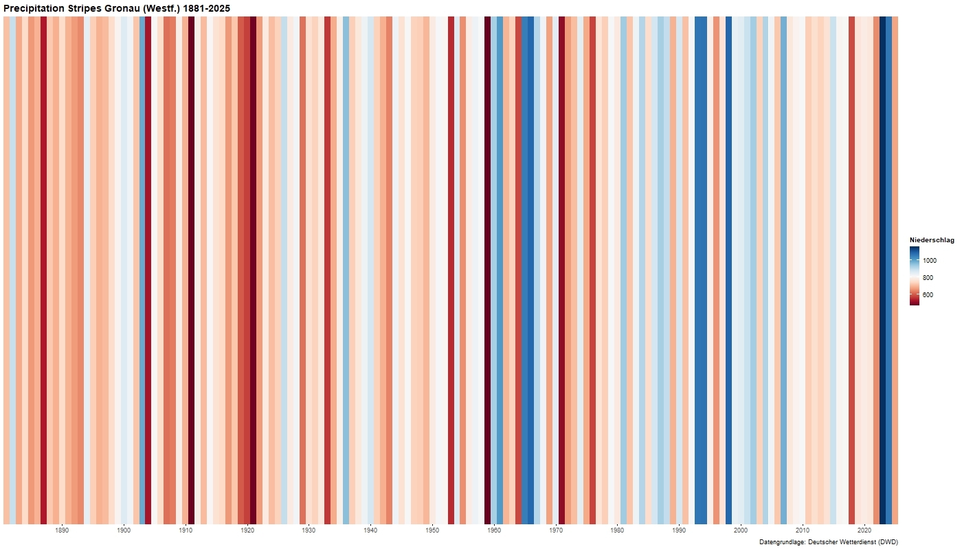 Jeder Streifen steht für ein Jahr: die Färbung spiegelt die jeweilige Abweichung der jährlichen Niederschlagssumme vom Mittelwert der international üblichen Referenzperiode 1961–1990 wider. Rottöne kennzeichnen zu trockene Jahre, während Blautöne niederschlagsreiche Jahre anzeigen. Deutlich erkennbar sind die teils erheblichen Schwankungen zwischen sehr trockenen und sehr nassen Jahren. Das trockenste Jahr im betrachteten Zeitraum war 1959 (Niederschlagsminimum), das niederschlagsreichste Jahr war 2023 (Niederschlagsmaximum). Nach zwei sehr nassen Vorjahren fiel das Jahr 2025 nun wieder deutlich zu trocken aus (LANUK, 2026)