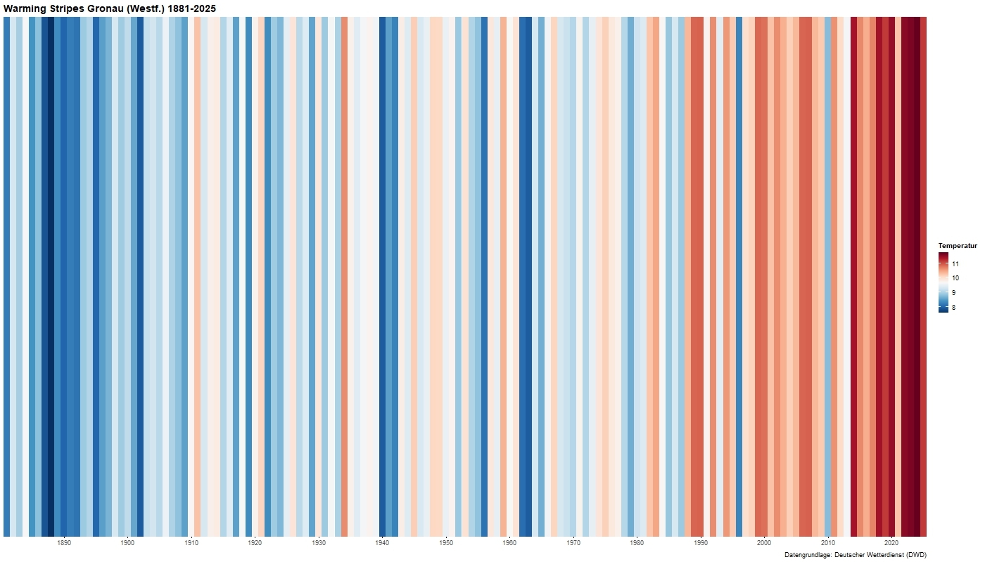 Die Grafik zeigt die sogenannten Wärmestreifen (Original: Warming Stripes) für Gronau von Beginn der Wetteraufzeichnungen 1881 (links) bis zum Jahr 2025 (rechts). Sie basieren auf einer Idee des Klimawissenschaftlers Ed Hawkins, der den Klimawandel für alle verständlich darstellen wollte. Sie wurde von dem Landesamt für Natur, Umwelt und Klimaschutz Nordrhein-Westfalen (LANUK) auf Grundlage von Daten des Deutschen Wetterdienstes erstellt.